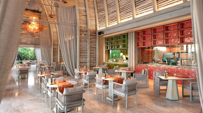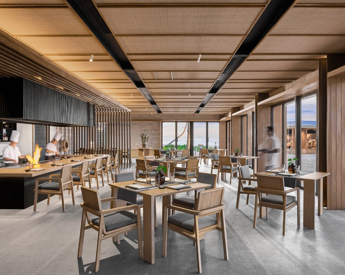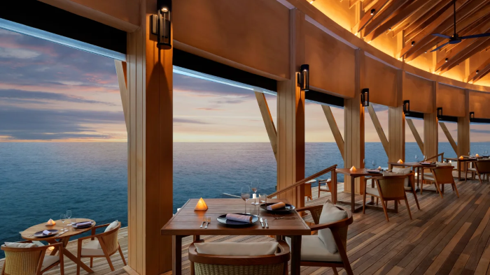 度假村八间餐厅和酒廊提供独特的环境,从漂浮的水上早餐,到日落时分的鸡尾酒,让宾客在世界各地的美味中开启和结束每一天。餐厅有低调的沙滩小屋Beach Shack,可将脚埋入沙子的同时享用各式披萨和烧烤海鲜;设有开放式厨房的Habitat,全天提供东西方与意大利风味美食;水上餐厅Origin,通过可持续的采购、存放和减排,呈现海鲜的最佳状态。