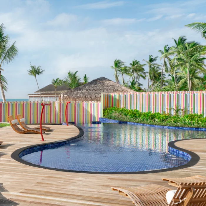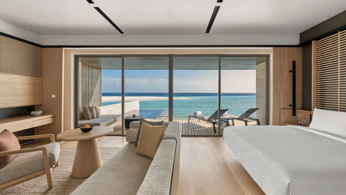 阿丽拉由新加坡建筑事务所Studiogoto设计,追求与自然和谐相处的宁静放松,每一间别墅都配有私人泳池。房间内饰采用舒缓的色彩和自然的纹理,兼具现代感与自然感。度假村共80座别墅,包括44栋海滨别墅和36栋水上别墅。海滨别墅面积202平米,位于岛上森林之间,有一条私人小路直通大海。水上别墅面积125平米,窗外阳光甲板与私人泳池相呼应,打造沉浸式的蔚蓝空间。