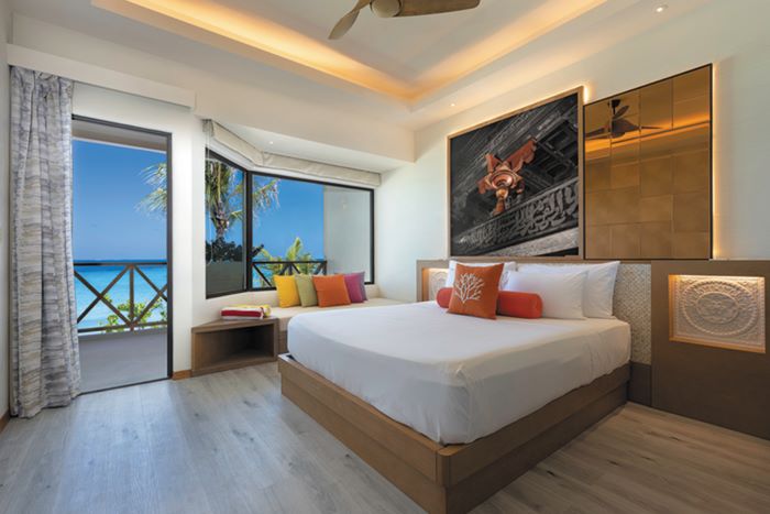 艾拉富士岛共有268套房间,提供4种房型选择,分别为沙滩别墅、水上别墅、海景房、海景家庭房,满足不同类型的度假需求。基础房型海景房透亮宽敞,白色的墙壁、木质纹理和彩色的靠垫营造出一种欢快的氛围,推开房门即可直通海滩。