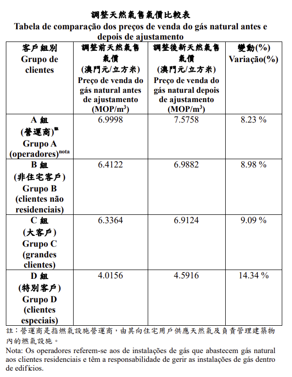 四个客户组别的天然气售气价格将分别上调约8%至14%(详见附表),其中住宅客户(A组)为主要的天然气用户,预计每月平均用气费将增加约澳门元7.5元。