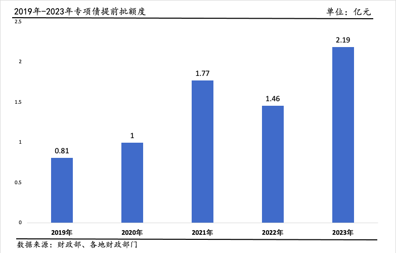 财政部提前下达的2023年新增专项债额度正是2022年新增专项债限额(3.65万亿元)的60%,这是2020年以来财政部首次顶格下达提前批专项债。