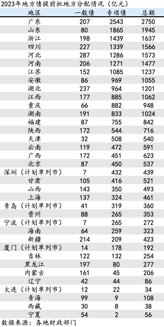 从专项债提前批分配额度来看,广东、山东、浙江和四川分配到的额度位居前四。其中,广东(不含深圳)分配到2543亿元,也是所有省份中唯一超过2000亿元的地区,山东、浙江、四川分别分配到1865亿元、1439亿元和1339亿元。而东北的黑龙江和辽宁,西北的内蒙古、青海、西藏和宁夏分配到的额度均未超过100亿元,青海、西藏和宁夏甚至不到10亿元,还不及大连一个市分配到的额度。