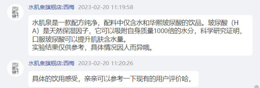 就玻尿酸而言,华熙生物在这一问题上显得语焉不详。2月20日,界面新闻记者向水肌泉饮料旗舰店咨询该产品功效时时,客服人员称,玻尿酸可以吸附自身质量1000倍的水分,科学研究证明,口服玻尿酸可以提升肌肤含水量。”但同时表示,“实验结果仅供参考,具体情况因人而异。”