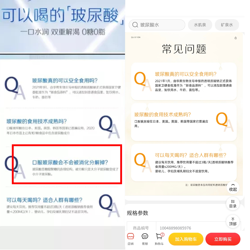 此外,值得注意的是,上海市消保委发文指出,店铺曾在回答“口服玻尿酸会不会被消化分解掉”时告诉消费者,玻尿酸经过消化会从大分子玻尿酸变成小分子玻尿酸。对于这一过程的阐释,上海市消保委希望企业能向消费者提供权威的证据证明。不过,当前这一问答已被删除,店铺文案仅保留了其他三个问答。