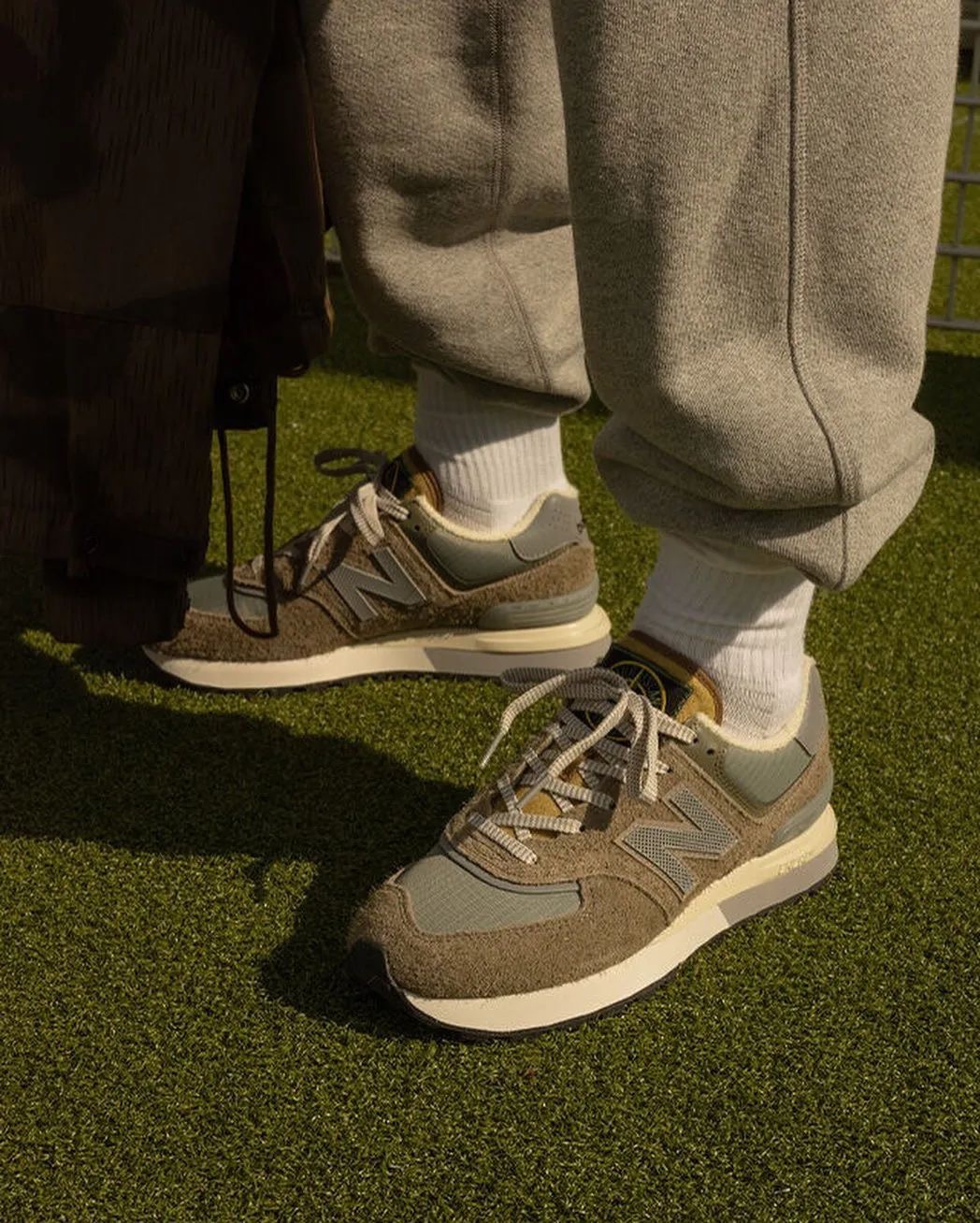 联名鞋款选用New Balance经典跑鞋574 Legacy为鞋型,以军绿色为主色调。