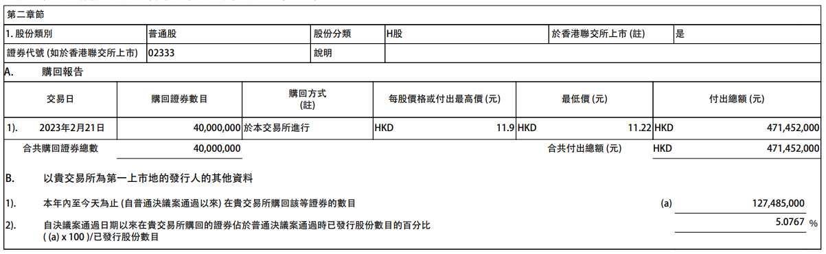 长城汽车2月21日在港交所公告称,今日耗资约4.71亿港元回购4000万股H股股份,每股回购价格11.22港元-11.9港元。