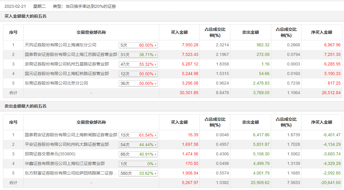 具体来看,知名游资现身龙虎榜,天风证券上海浦东分公司、章盟主(国泰君安证券上海江苏路证券营业部)分别买入7950.28万元、7523.43万元;国泰君安证券上海新闸路证券营业部、平安证券杭州杭大路证券营业部分别卖出6417.86万元、5831.87万元。