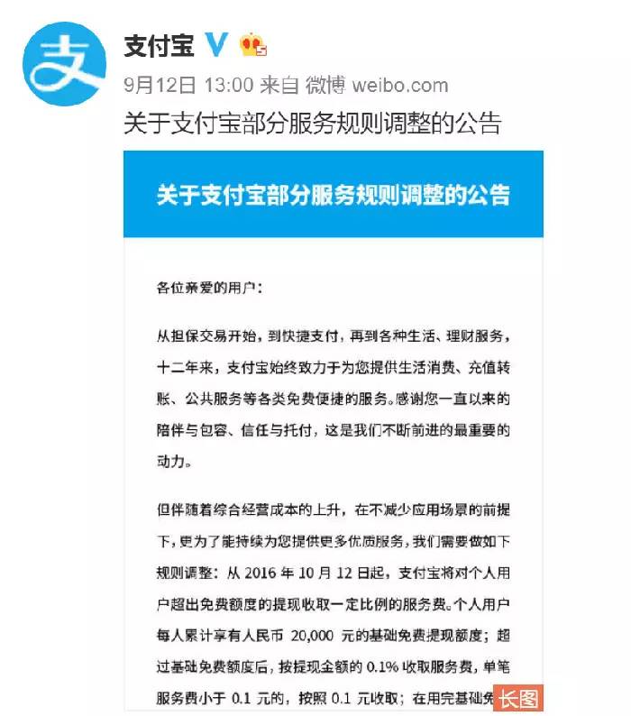 还记得一个月前支付宝发布的关于收取提现手续费的公告吗?10 月 12 日起,支付宝将对个人用户超出免费额度的提现收取 0.1% 的服务费。也就是说,从明天起,我们就要告别支付宝免费提现的时代了。
