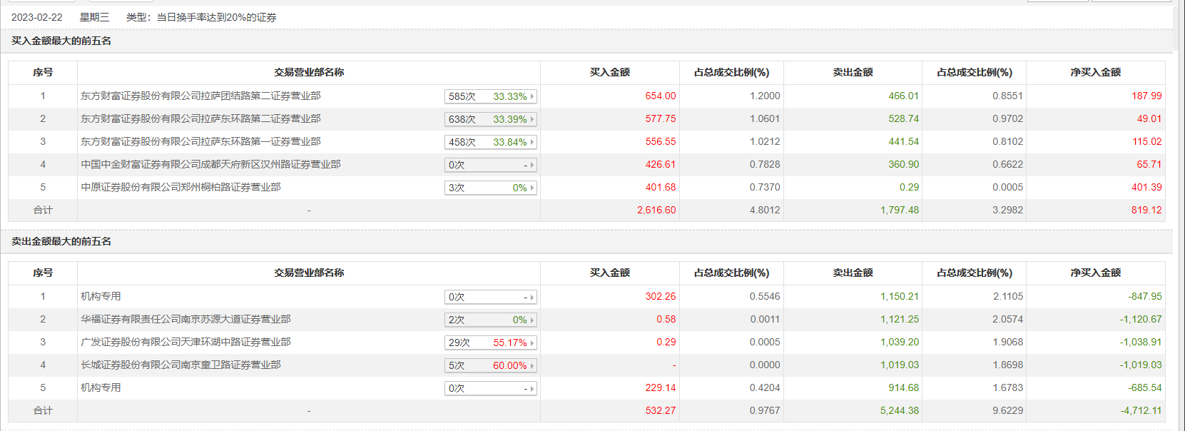 具体来看,机构买入531.4万元,卖出2064.89万元,合计净卖出1533.5万元。此外,华福证券南京苏源大道证券营业部、广发证券天津环湖中路证券营业部分别卖出1121.25万元、1039.20万元;东方财富证券拉萨团结路第二证券营业部、东方财富证券拉萨东环路第二证券营业部分别买入654.00万元、577.75万元。