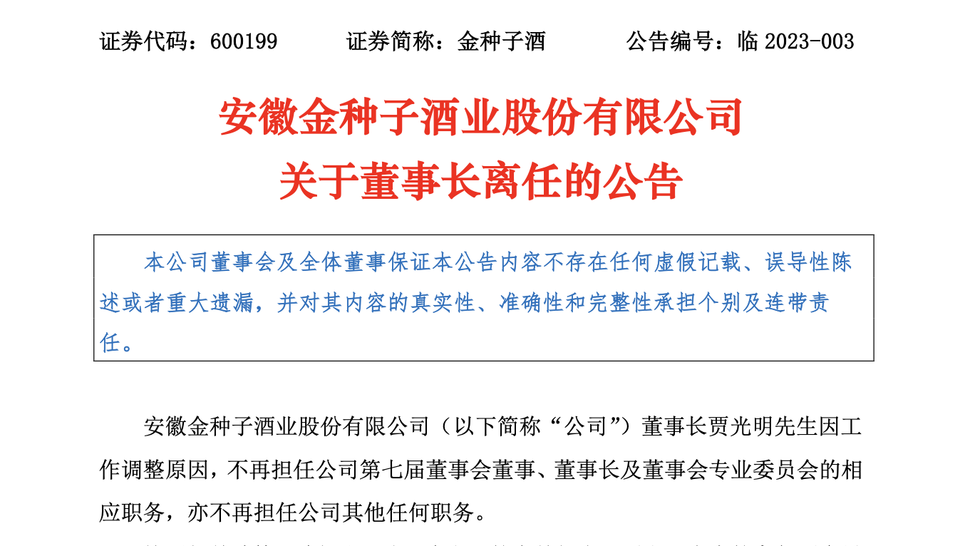 2月22日,安徽金种子酒业股份有限公司(以下简称“金种子酒业”)(600199)发布《关于董事长离任的公告》显示,公司董事长贾光明因工作调整原因,不再担任公司第七届董事会董事、董事长及董事会专业委员会的相应职务,亦不再担任公司其他任何职务。
