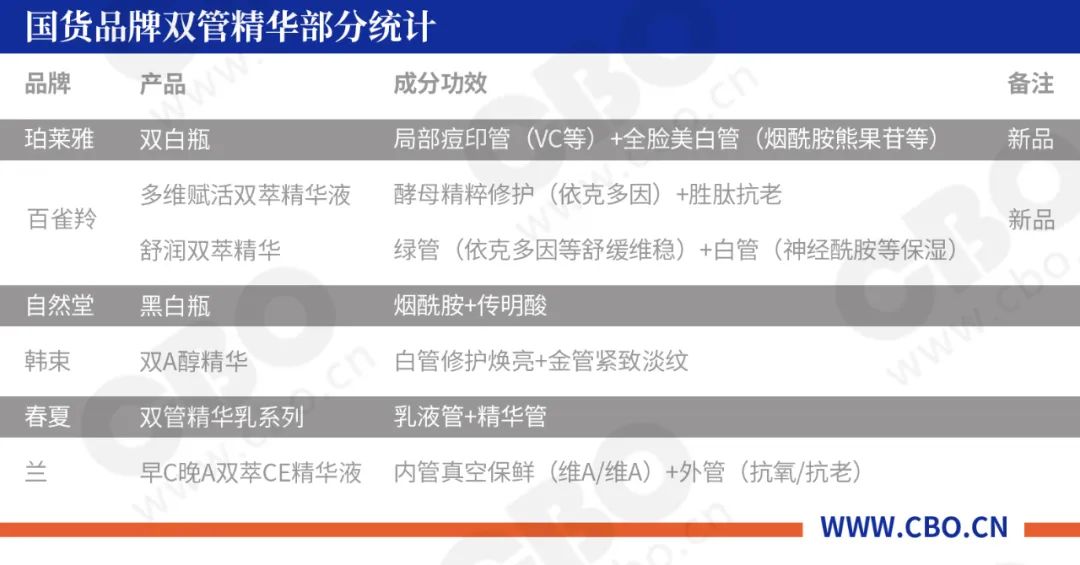 功效护肤时代浪潮之下,消费者对于产品成分的了解更加深入,国货品牌的自主研发意识不断上升,双管精华作为“秀研发”、“秀成分”的利器也广受国货品牌们的青睐。