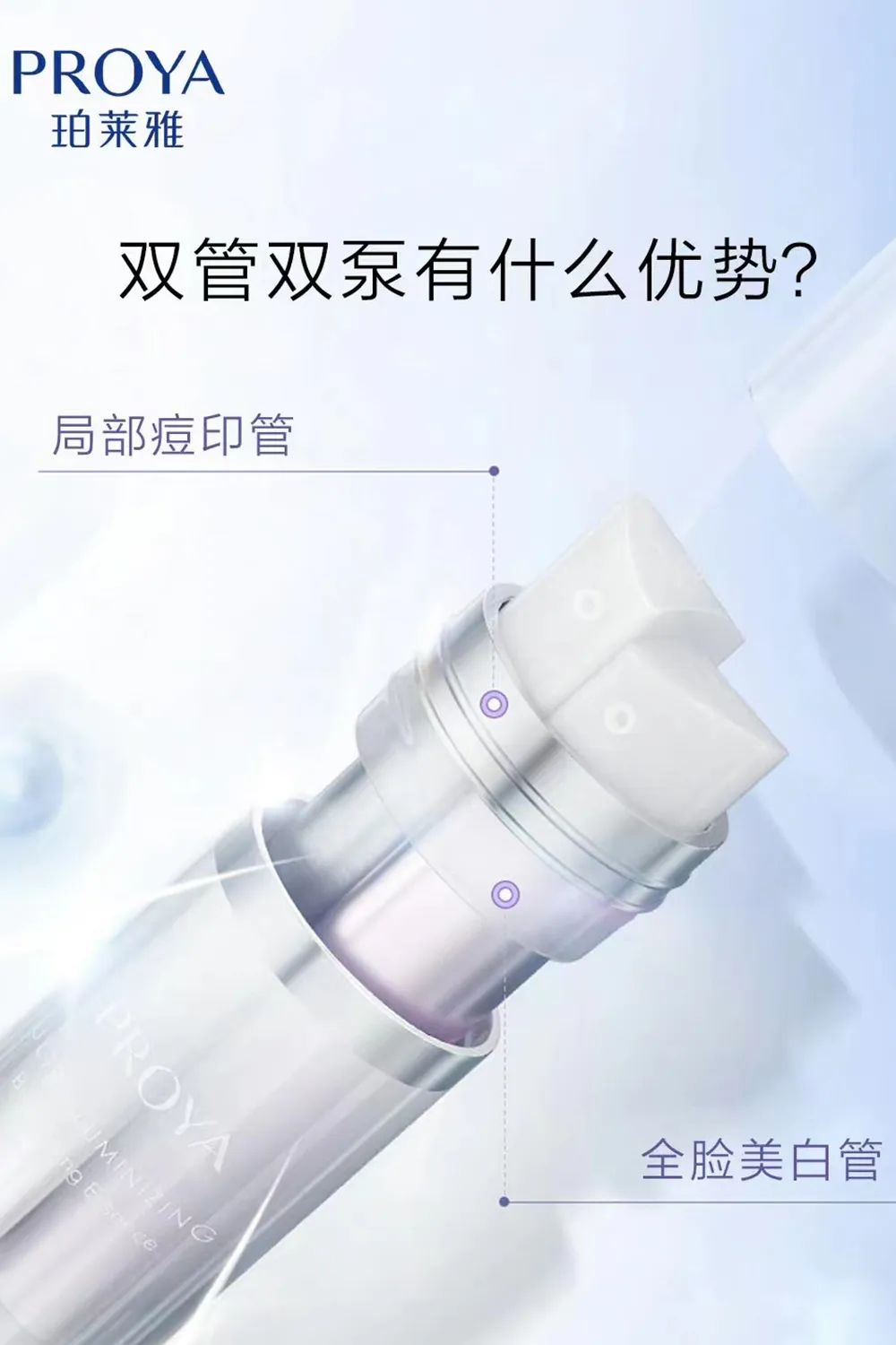 作为珀莱雅首款双管精华,双白瓶在设计之初,想要做一支更加精细化的美白精华,考虑到消费者不仅有全脸美白的需求,也有淡化痘印的美白需求,因此双白瓶并没有采取让精华在泵头处混合的设计,而是设置了两个按压泵,可以分别使用两种精华,也可两泵同时按压混合使用,提供了一种更加灵活的设计思路。
