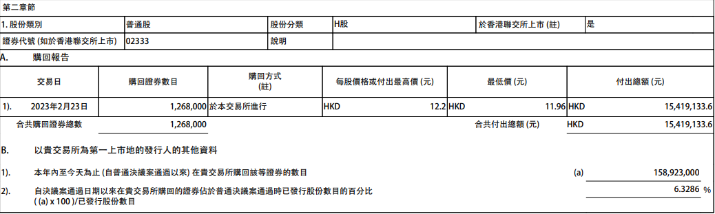 长城汽车2月23日在港交所发布公告,今日耗资约1541.91万港元回购126.8万股H股,回购价介于11.96港元至12.2港元。