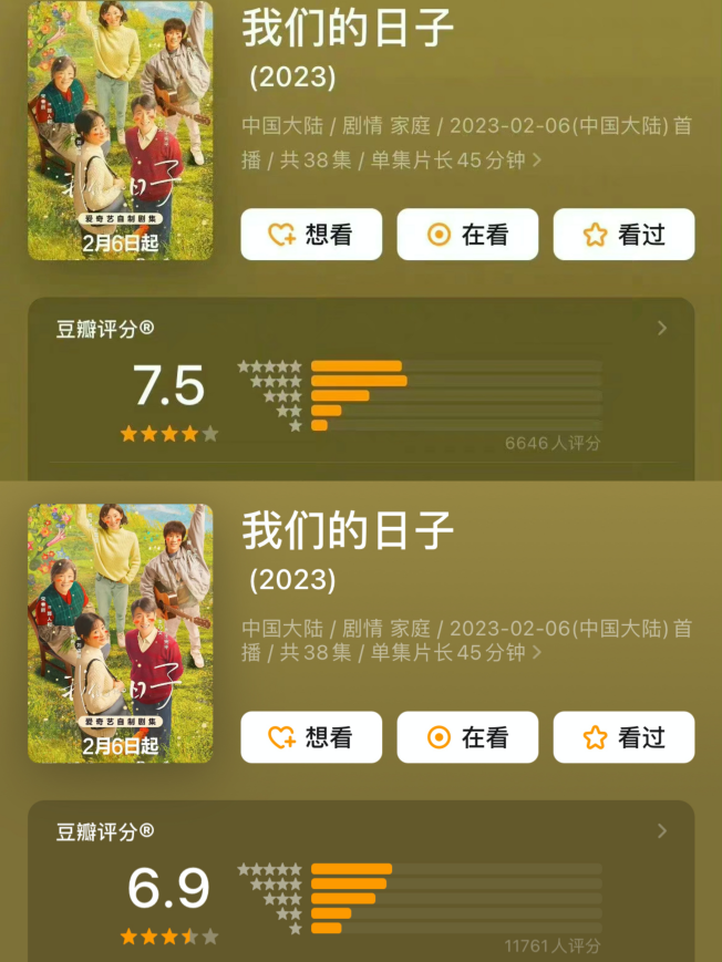 而同时,女性与生子话题、年轻主角人设以及读诗、旁白等表现形式等争议也围绕在《我们的日子》中,这也使得该剧评价两极,其豆瓣6.9分,低于《人世间》的8.1分,更不能与神剧《父母爱情》的9.5分与经典老剧《金婚》8.5分相比。buff叠满的《我们的日子》究竟还差什么?