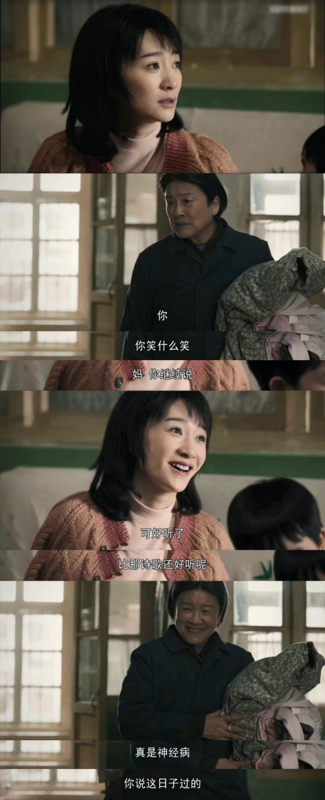 而这些带有毛刺儿的人物最不缺少的就是人情味,就像宋春丽饰演刘母重返女儿家担起管家重任,刘淑霞惊奇地发现母亲的唠叨的美妙胜过诗歌,这一幕多少让屏幕前的观众共情到母爱,由此产生出情感的连接。
