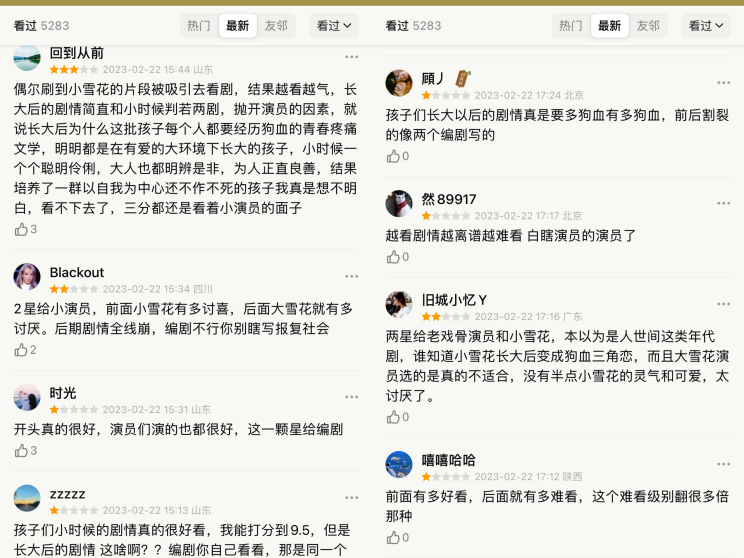 要知道,扮演成年雪花的96年女演员周依然此前在B站的《风犬少年的天空》和《三悦有了新工作》都受到好评,剧集评分也都在8分以上,但青春校园叙事、95后职场叙述与年代生活剧有本质上的差别,受众也并非同一拨。观众希望在年代生活剧里感受老一辈的烟火气,而非年轻一辈的硬拗出来的“疼痛青春”,事实也证明了,成年雪花跳脱的表演方式和年代剧并不适配。