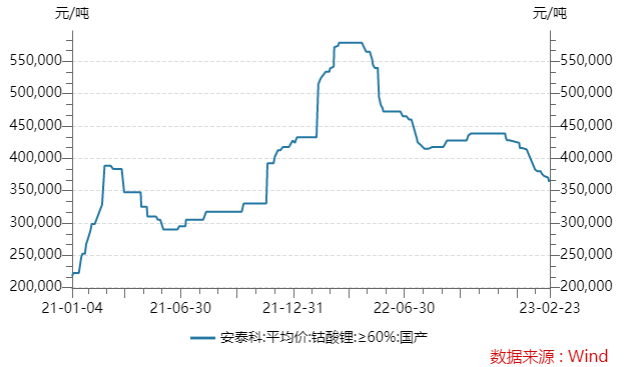 WIND数据显示,安泰科钴酸锂在2022年达到高位57.90万元/吨,较一年前的价格翻倍,虽然下半年价格有所回调,但全年仍处于高位区间。