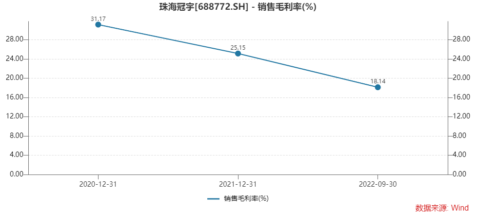 珠海冠宇近年综合毛利率每年大降一个台阶。去年前三季度公司综合毛利率降至18.14%,其2020年和2021年综合毛利率分别为31.17%和25.15%。