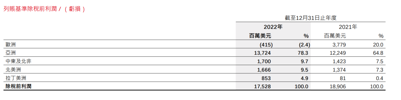 欧洲地区业务骤然缩减。2022年,欧洲地区除税前利润亏损4.15亿美元,2021年为37.79亿美元,贡献利润占比从20%下滑至-2.4%。