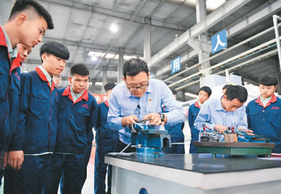 方文墨(中)为职业院校学生作钳工职业技能操作示范。受访者供图