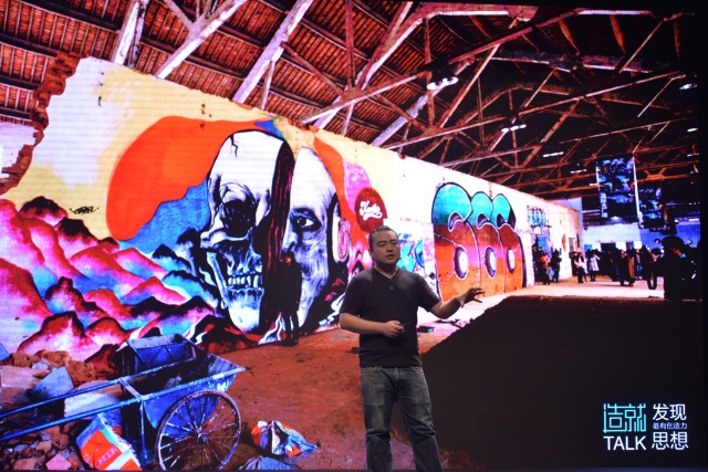 但是当我们在这里举办了两天的活动,我们通过绘画的形式、涂鸦的形式,通过行为艺术,通过音乐,通过舞蹈,甚至通过极限运动,并且把中国的一些街头文化的元素也纳入进来,比如说在街边打个麻将,下个象棋,吃个黑暗料理,摆个地摊……我们把它们纳入进来之后,发现,两天过后我们把这个房子里面的这堵墙变成这样的一个场景。