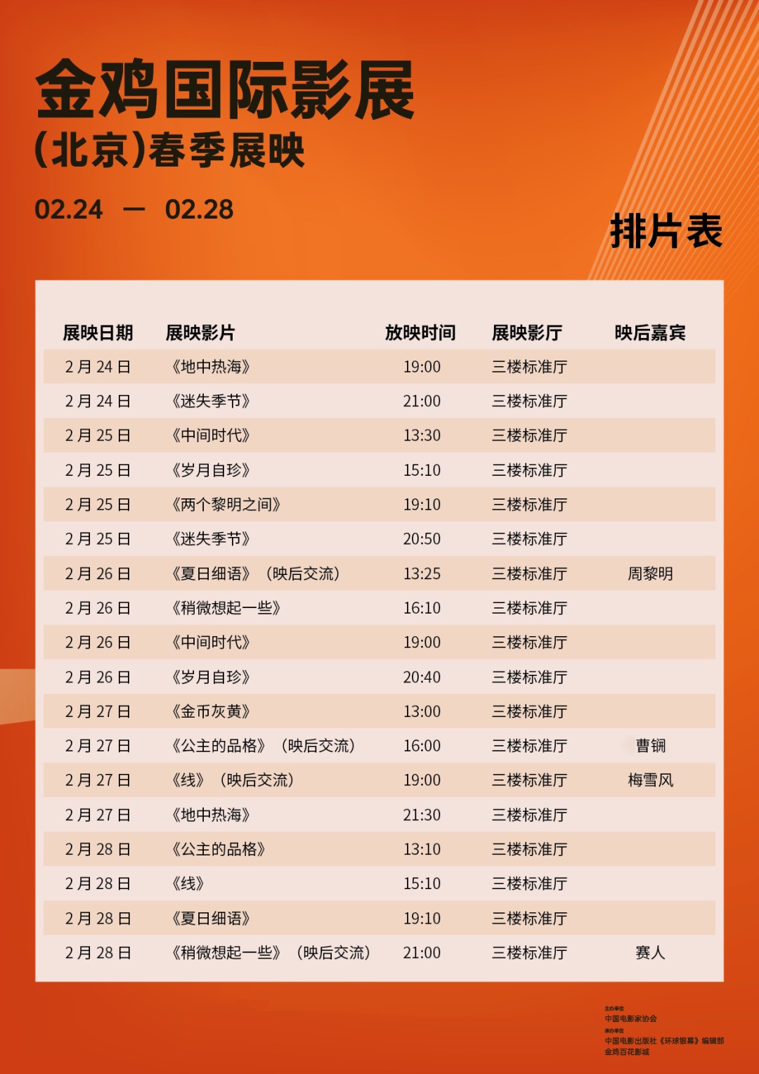 金鸡国际影展(北京)春季展映将于2月24日至28日在北京金鸡百花影城举行,影展共展映10部影片,展映期间,活动方还将邀请周黎明、赛人、梅雪风等知名影评人及《环球银幕》杂志主编曹锎参与部分影片映后交流。
