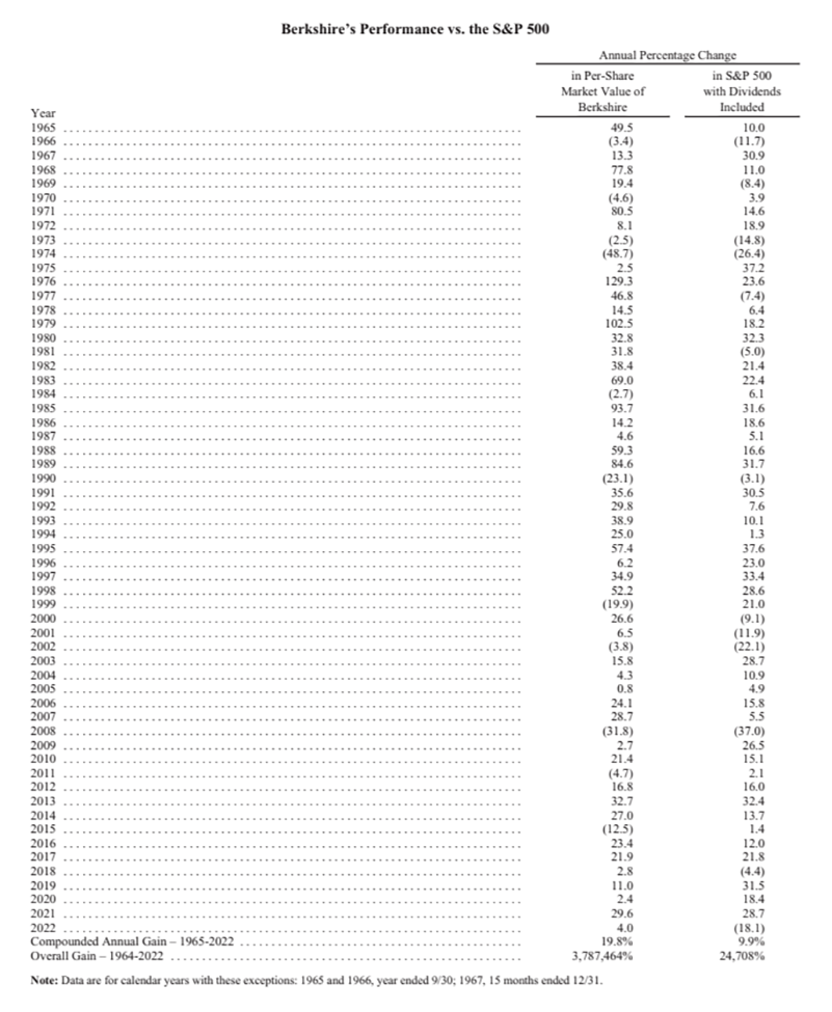 按照惯例,股东信是巴菲特旗下公司伯克希尔的业绩与美股风向标:与标普500指数表现的对比,2022年伯克希尔年复合收益率大幅跑赢标普500指数22.1个百分点。长期来看,自从1965年到2022年期间,伯克希尔公司的年复合收益率19.8%,明显超过标普500指数的9.9%,而1964年至2022年伯克希尔的总体收益率是令人吃惊的3787464%,也就是37874倍多,而标普500指数为 24708%,即超过247倍。