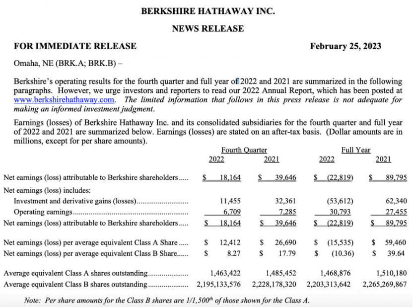 巴菲特的投资成绩单显示:2022年度伯克希尔净亏损228.19亿美元,但巴菲特表示伯克希尔公司在2022年度过了美好的一年。