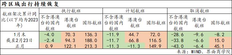 国内航班(不含港澳台,下同)恢复速度也在加快。国内航班执行架次连续三个月环比正增长,同比增速也在2月份转正。从累计同比增速看,截至2月23日,国内航班执行架次累计同比仍然负增长,较上年同期下降2.4%,不过,正月国内航班执行架次同比已经实现正增长。