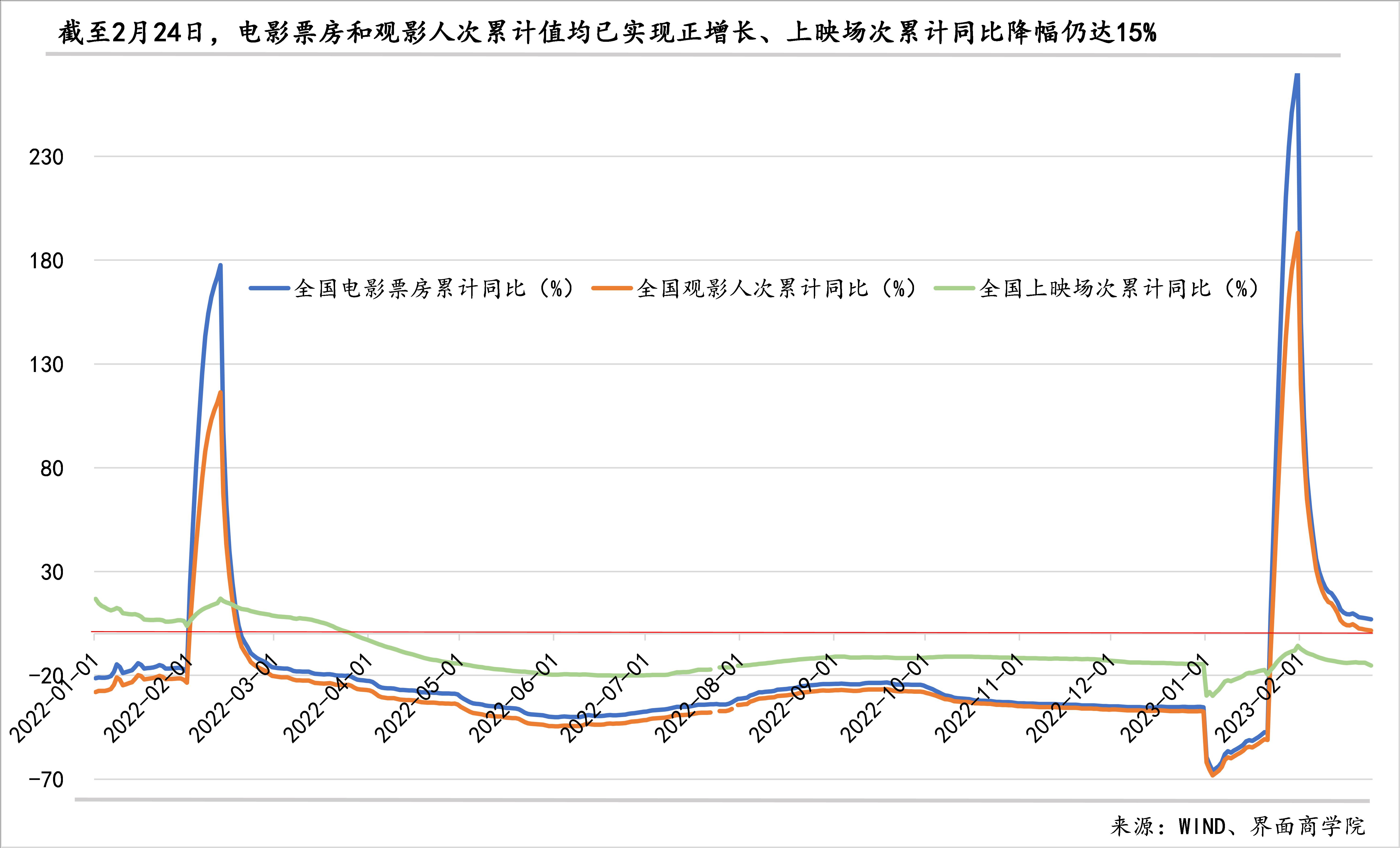 电影市场同比好转,但还未恢复到疫情前水平:电影市场是在春节档以非常火爆的姿态回归,全国票房累计增速一夜之间从下降48%逆转为增长9%,此后快速大幅上涨,到1月底达到阶段性高点273%,然后回落,到2月24日,全国票房累计增速仍有7%。与线下消费关系密切的外出观影人次也表现出相似的变化,节后外出观影人次增长动力明显不足,累计同比增速持续放缓,至2月24日已降至1.6%。