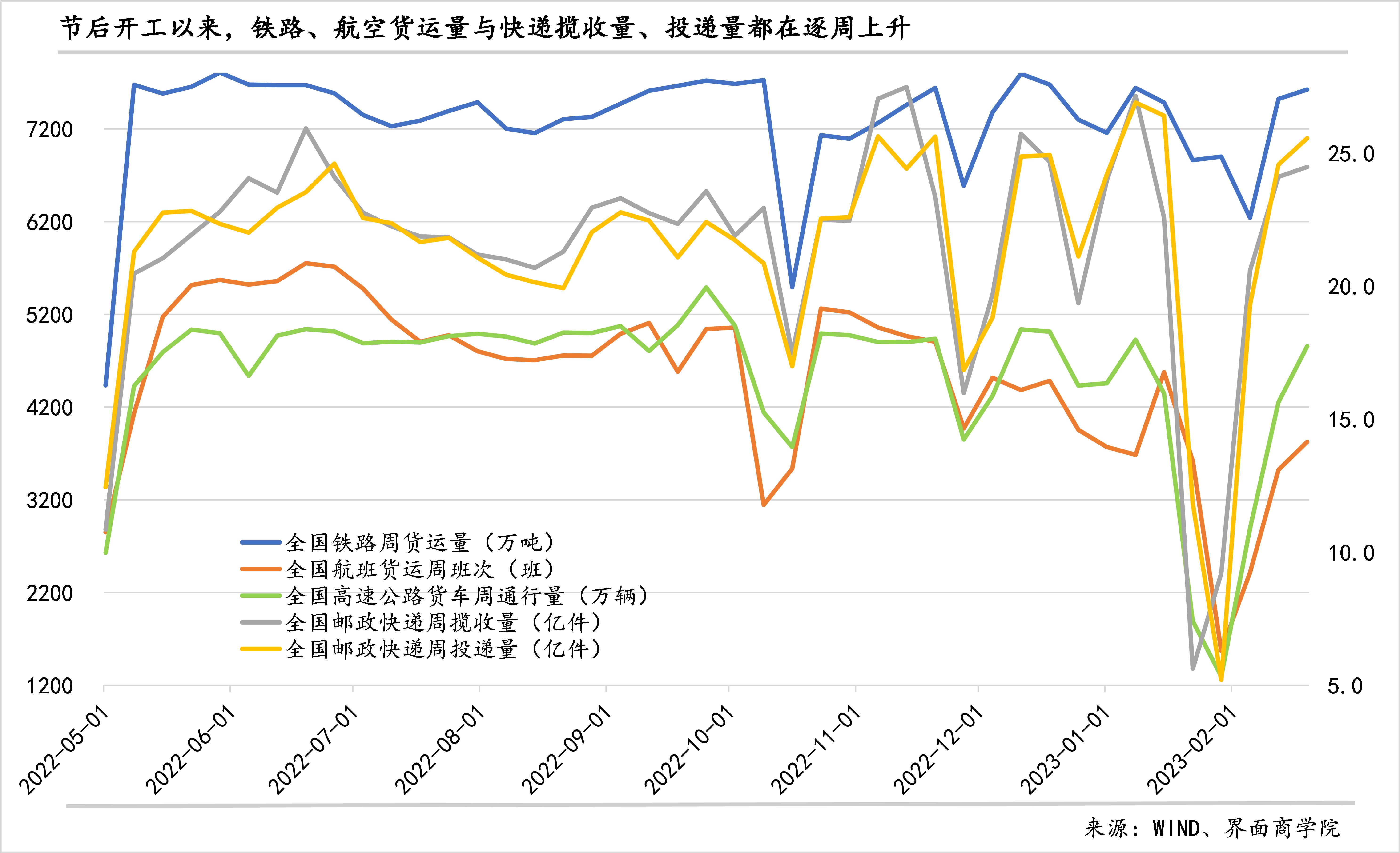 各渠道货运在全方位回升,但国际货运恢复明显偏慢:春节后,铁路、航班、高速公路的货运都在逐周上升。全国铁路货运量、邮政快递揽收量和投递量均在2月12日当周超过了平均值(交通部自2022年5月开始对外连贯公布该数据,下同),2月19日当周进一步上升;全国高速公路火车通行量、全国航班货运周班次(国内)也在2月19日当周超过了历史均值。