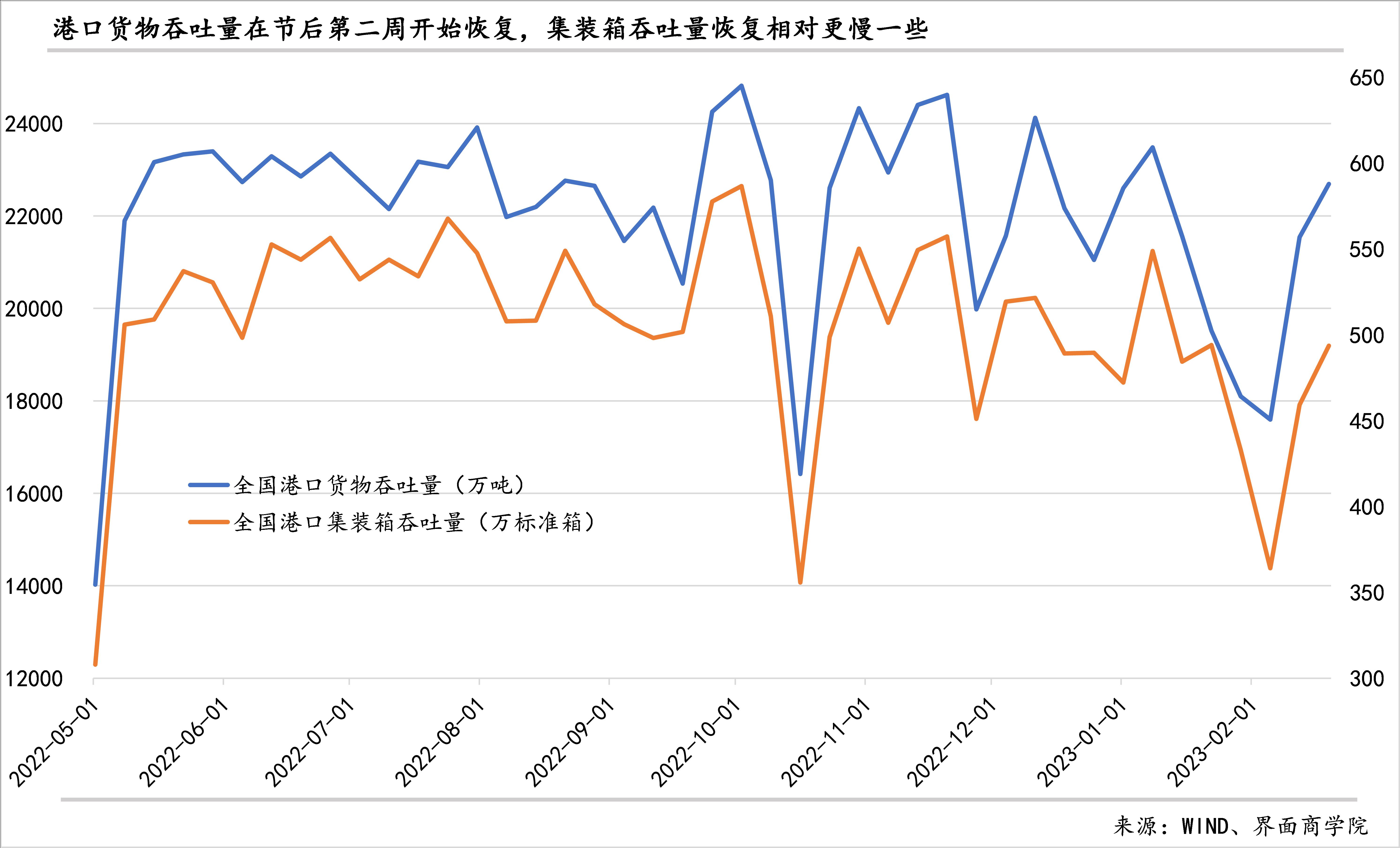 不过,国际货运恢复明显偏慢。一是全国货运航班班次(国际)仍然低于历史均值。与2022年最后一周相比,全国航班货运班次(国际)则下降了3.3%。二是全国港口集装箱吞吐量虽在2月12日当周开始回升,2月19日当周超过了上年末,但仍略低于历史均值。