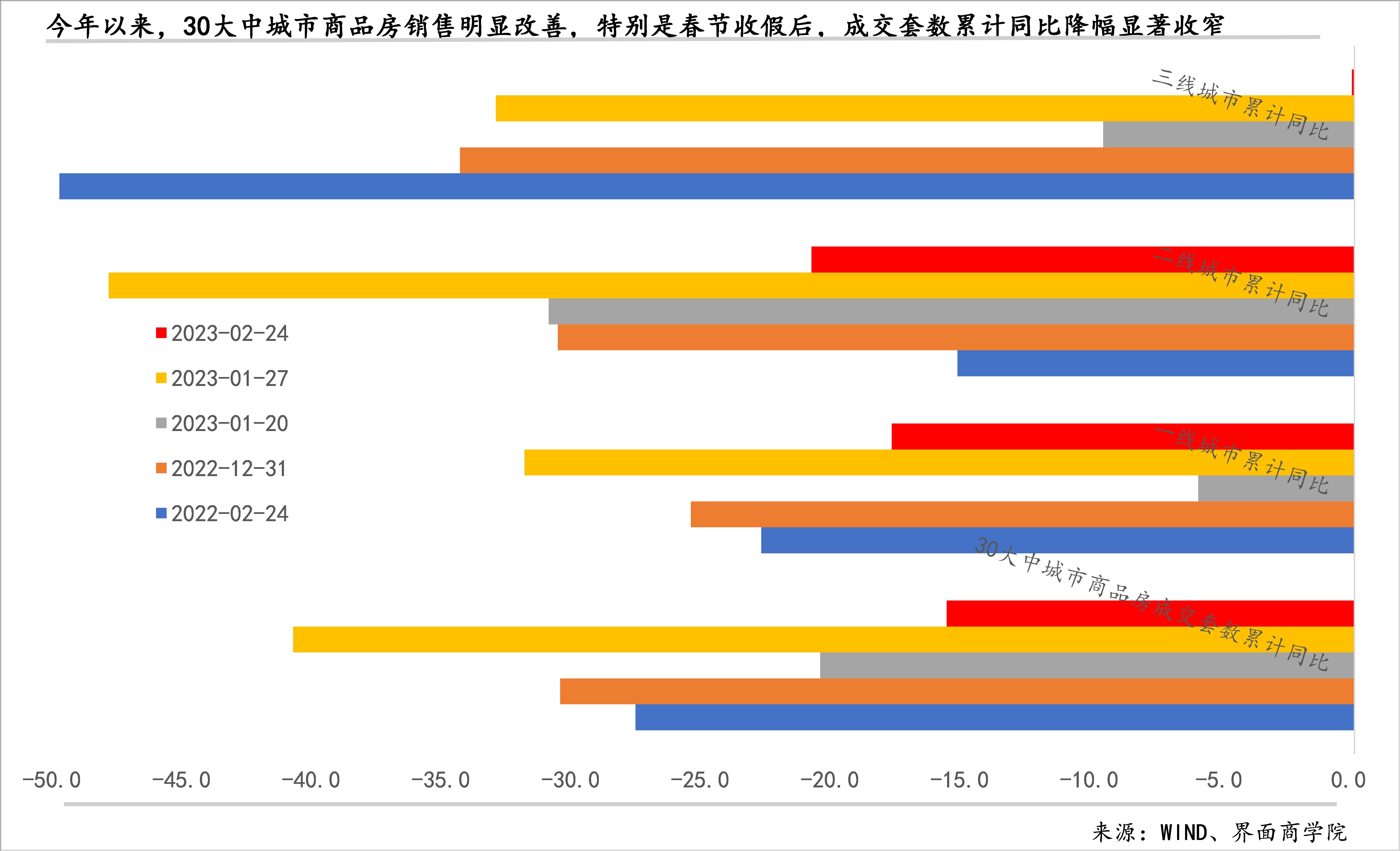 商品房成交降幅在收窄,部分城市已实现正增长:今年以来,商品房销售成交套数累计同比降幅显著收窄,截至2月24日,30大中城市商品房成交套数累计同比降幅为15.7%,较上年末的30.6%和上年同期的27.7%显著收窄;三线城市改善最为明显,同比降幅已接近零,一线城市同比降幅近18%,二线城市降幅逾20%。