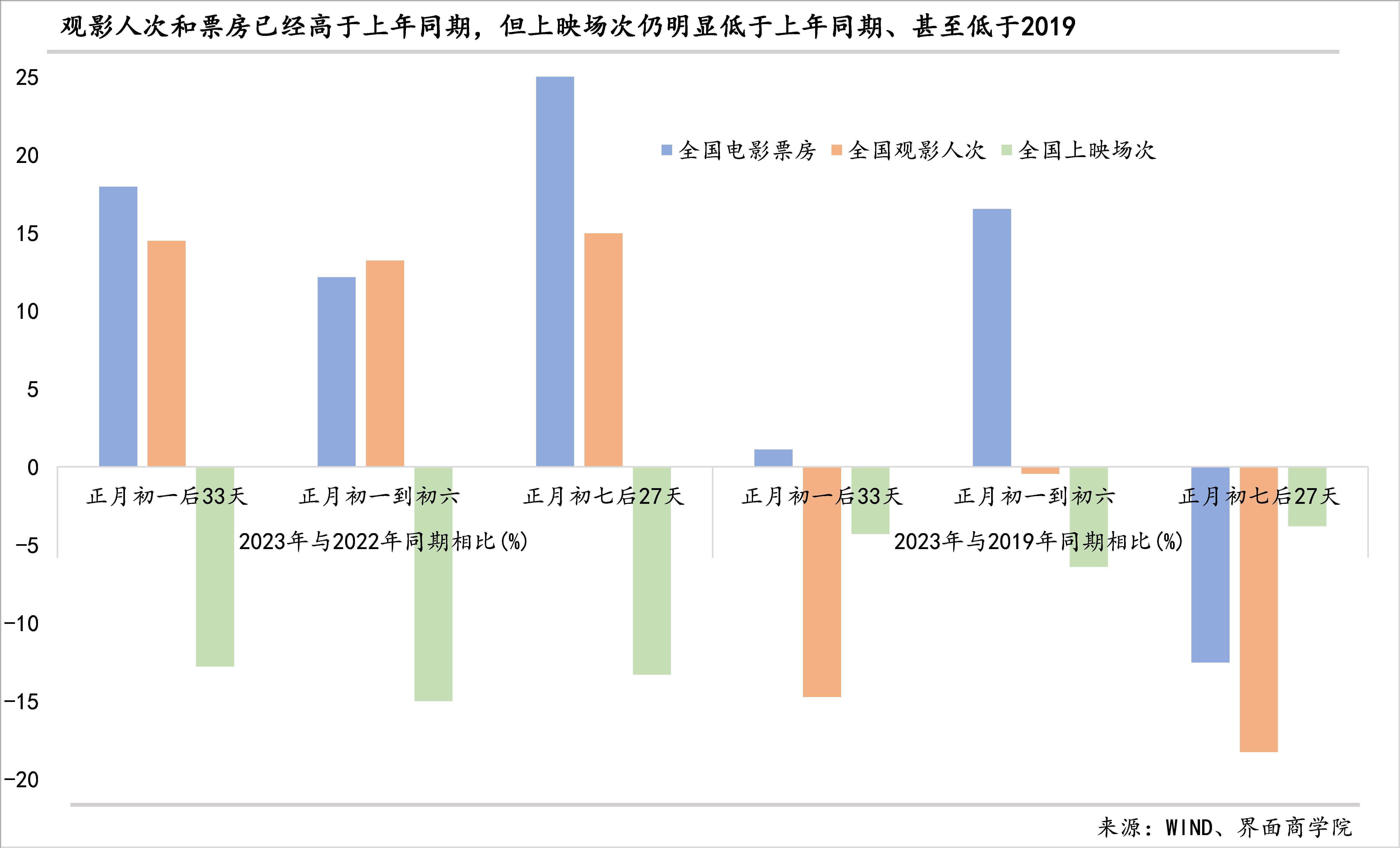 我们从农历出发,选取了正月初一、正月初七开工为时间节点,分别与2022年和2019年进行了比较,结果显示,正月初一后的33天观影人次同比增长14.5%、电影票房同比增长18.0%,节后开工27天,观影人次和电影票房同比15.0%、25.6%,不过,上映场次同比则下降12.8%、13.3%;结果还显示,观影人次和上映场次仍未恢复到疫情前的水平,正月初一后33天较2019年同期分别下降了14.7%、4.2%,电影票房虽然较2019年上涨了1.1%,但节后开工27天的票房较2019年同期减少了12.5%。