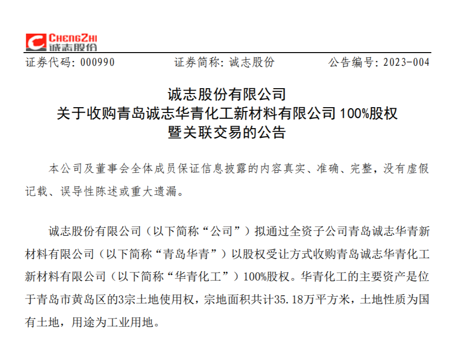 近日,诚志股份发布公告称,拟通过全资子公司青岛诚志华青新材料有限公司(以下简称“青岛华青”)以股权受让方式收购青岛诚志华青化工新材料有限公司(以下简称“华青化工”)100%股权。