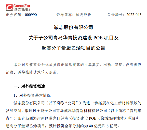 据了解,诚志股份早在去年8月份就对外披露称,公司拟通过全资子公司青岛华青在青岛西海岸新区董家口经济区投资建设POE(聚烯烃弹性体)项目和超高分子量聚乙烯项目,预计投资金额分别约为40亿元和8亿元。