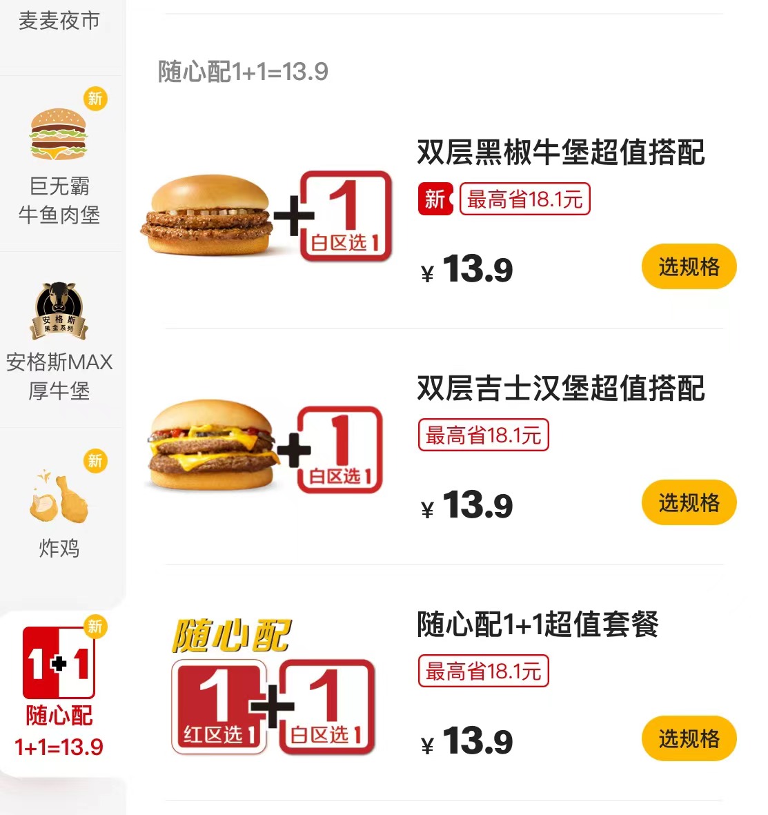 消费者喜欢便宜、性价比高的产品,而套餐的模式就是让消费者潜意识认为点套餐会比单点要便宜,满足大家“有优惠就占”的心理。比如,在麦当劳“1+1随心配”的排列组合方式里,分为红区和白区,配合官方给出的随心配计算器快速计算(例如红区点大鸡排,白区点红茶,合计可以省下10.5元),让你产生“只要够穷,就可以解锁更多省钱吃法”的想法。