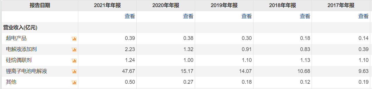 根据过往的营业构成看,锂电池电解液构成了公司的主要营收,2021年公司营收达52.03亿元,仅锂电池电解液贡献了47.67亿元,当期总营收的比重超90%。