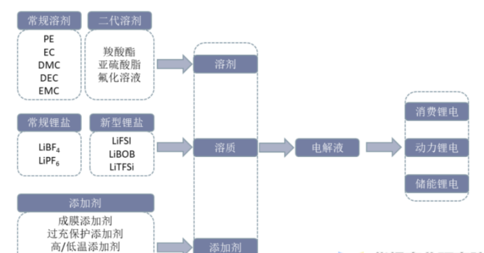 - 电解液产业链上游主要包括溶剂、溶质、添加剂;