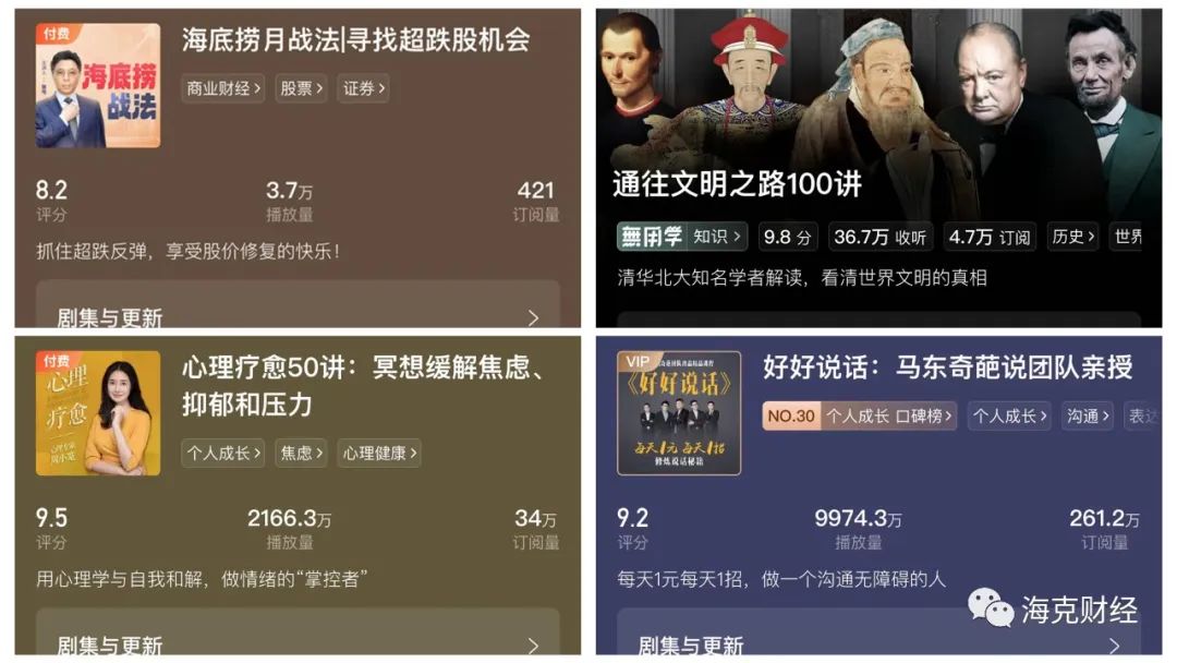 支付了颇高的成本,收益却不尽如人意。据海克财经观察,像“好好说话”这样订阅量数百万的付费产品在喜马拉雅平台极为罕见。吴晓波的“每天听见吴晓波”第一季至第四季,每季订阅量11万-18万,第五季订阅量仅7.2万,自2021年11月更新至今的第六季订阅量稍高一点为21.6万;“于丹品经典:过你想要的人生”订阅量29.9万;“易中天中华史”订阅量25.2万。
