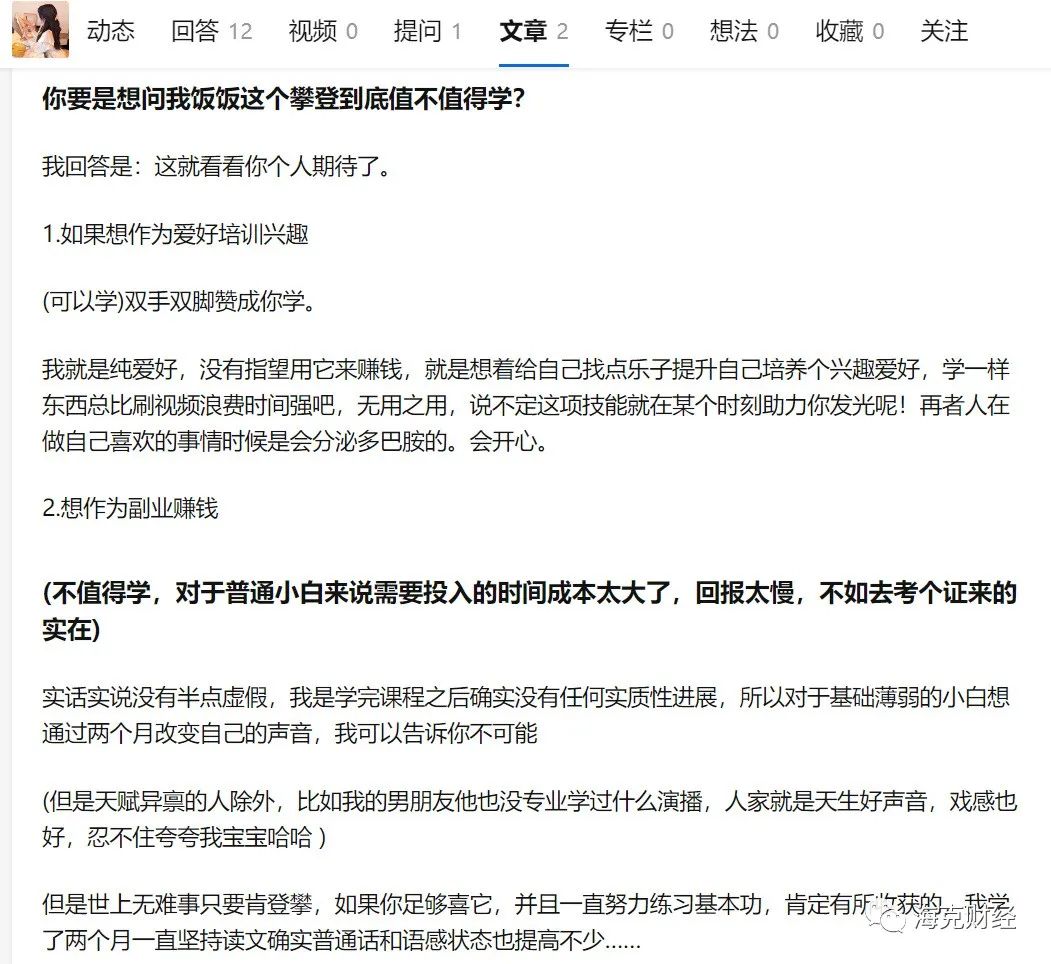 问题也因此出现。一些用户在培训结束后发现,自己很难凭借这些内容赚取收益,便怒而投诉喜马拉雅虚假宣传。有用户称,喜马拉雅承诺的学员扶持、试音机会等,自己从来没有收到过。一位昵称“费饭饭”的网友在知乎上详细写出了自己参加第57期喜马拉雅攀登计划设备版的全过程和感受,表示完全不建议想要急于变现的用户参加这样的培训,感觉自己学完课程之后没有实质性进展。