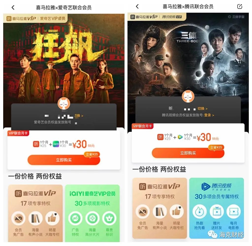 不算低的会员价格难以博得用户认同,平台的流量和转化成了问题。目前喜马拉雅连续包月每月费用为20元,连续包年每年费用为198元,基本与知乎、B站、芒果TV齐平,略低于爱奇艺、腾讯视频等平台。但有很多渠道免费赠送喜马拉雅会员,比如腾讯视频会员、芒果TV会员、京东Plus会员等。在喜马拉雅会员充值页面,现在还有“联合会员套餐”选项,单价30元的爱奇艺、腾讯视频月卡,加上1个月喜马拉雅会员,价格仍为30元。