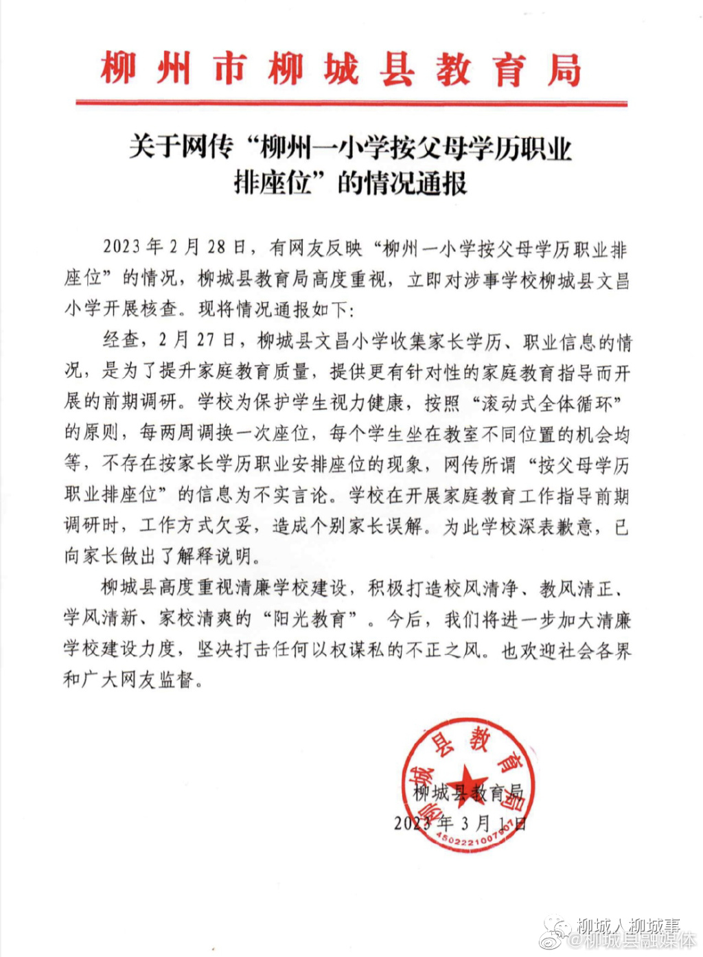 @柳城县融媒体 微博消息,柳城县教育局发布《关于网传“柳州一小学按父母学历职业排座位”的情况通报》:经查,2月27日,柳城县文昌小学收集家长学历、职业信息的情况,是为了提升家庭教育质量,提供更有针对性的家庭教育指导而开展的前期调研。学校为保护学生视力健康,按照“滚动式全体循环”的原则,每两周调换一次座位,每个学生坐在教室不同位置的机会均等,不存在按家长学历职业安排座位的现象,网传所谓“按父母学历职业排座位”的信息为不实言论。学校在开展家庭教育工作指导前期调研时,工作方式欠妥,造成个别家长误解。为此学校深表歉意,已向家长做出了解释说明。