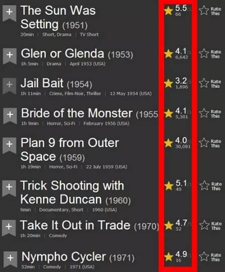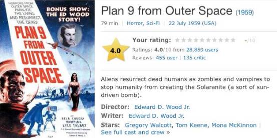 要说到他的影片有多烂,就不得不提他的《外太空计划9》。这部电影曾在IMDb上雄霸“得分最低影片”称谓近半个世纪,被誉为WFEM(Worst Film Ever Made,即影史烂片儿之王)。