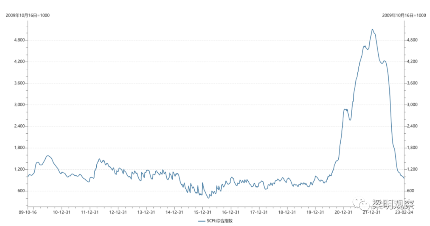 从集装箱即期运价来看,运价从2022年初触顶之后,一直延续下跌态势。截至2月24日,上海出口集装箱运价指数(SCFI指数)收于946.68点,环比继续回落。目前运价处在成本支撑位附近,运价正在向疫情前正常水平的中枢回归,也就说运价的下跌是运价向正常状态的回归。