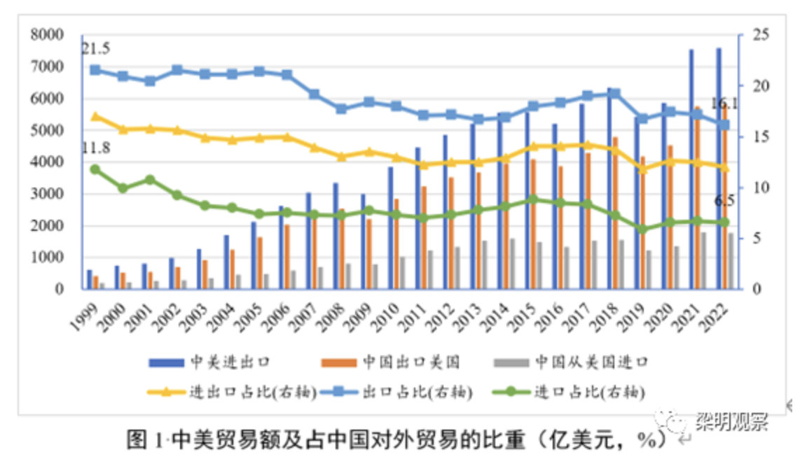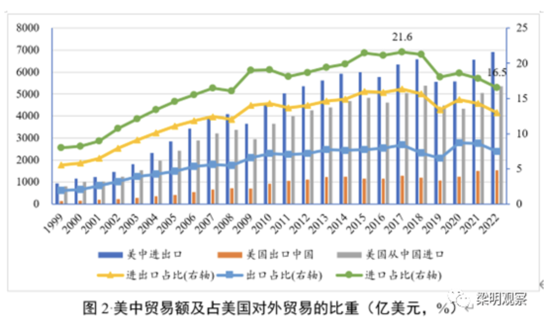 从图1可以看出,中美贸易额占中国对外贸易的比重整体延续了下降的趋势,中国对美国出口所占的比重已经从1999年的21.5%下滑到2022年的16.1%了。从图2也可以看出,自从2017年美国发起对华的贸易战以来,美国与中国贸易额所占的比重也在稳步下降。但美国从中国的进口额依然在创历史新高。美国与中国的经贸脱钩,降低的是对中国的依赖度,降低的是相对重要性。美国短期内在经贸上完全与中国脱钩既不现实也不可能,长期脱钩可能需要较长一段时间。也就是说,未来一段时间,中美贸易的份额可能会持续小幅下降或者低位保持稳定,但中美贸易额有可能还会再创新高。
