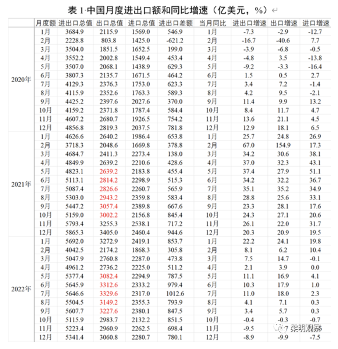 在以往年份,每年四季度都是中国出口的高峰期,在2020年(含)以前,中国月度出口的最大值是2819亿美元,月度出口额从来没有超过2900亿美元。2021年以来,疫情导致全球供应链紧张,外贸运输缺船、缺箱、缺柜问题突出,海运价格突破历史新高,港口拥堵严重。在此背景下,美欧等国进口商普遍提前大量囤货补库存,由此导致了从2021年下半年开始,我国月度出口规模普遍偏高。2022年5-8月,这种效应依然存在,中国月度出口额均在3000亿美元以上,年内出口最高值出现在7月份(当月出口额为3330亿美元)。2022年四季度,随着这种补库存效应的减弱,中国月度出口规模环比开始下降,但规模依然在3000亿美元左右,虽然相对于2021年同比有所下降,但从历史数据来看,规模依然不小,谈不上趋势变坏。
