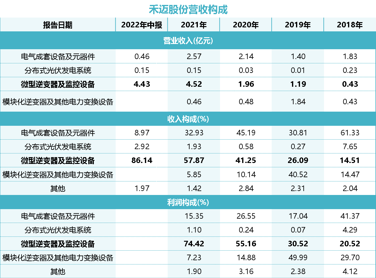 2021年,微型逆变器及监控设备贡献了禾迈股份近58%的主营业务收入,2022年上半年,这一比例增加至87%。