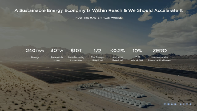 当地时间3月1日,特斯拉在美国得州奥斯汀工厂举行首次投资者日活动。特斯拉CEO马斯克在特斯拉投资者日上介绍发展可持续能源的“宏图计划3”(Master Plan 3),称实现可持续的能源经济需要达到这些目标:储能240 TWH,可再生电力30 TWH,制造领域投资10万亿美元,能源要求为燃料经济的一半,占地面积低于0.2%,占2022年全球GDP的10%,无法克服的资源挑战为零。