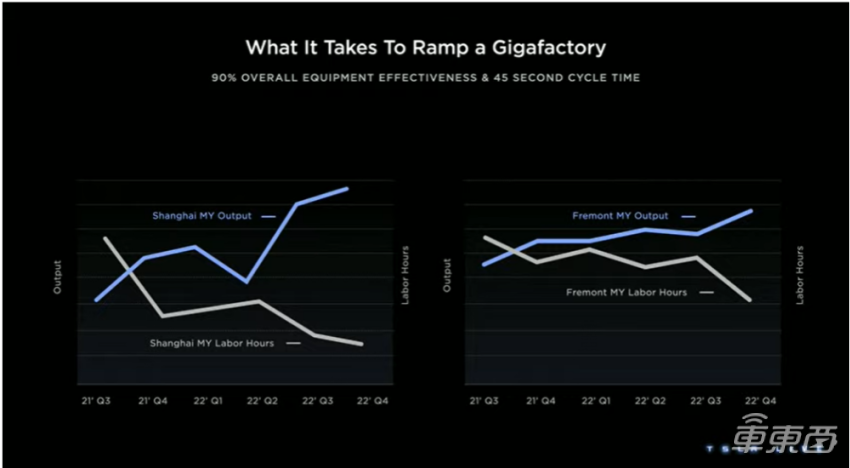目前特斯拉的产线智能化程度非常高,这也提升了产品的生产效率,现阶段,上海工厂每45秒就会有一辆车从组装线上下线。